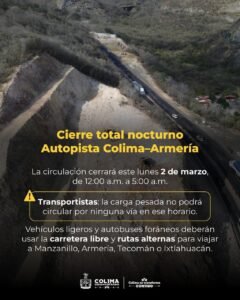 Gobierno del Estado alerta por cierres nocturnos en autopista Colima-Manzanillo, tramo ‘La Salada’