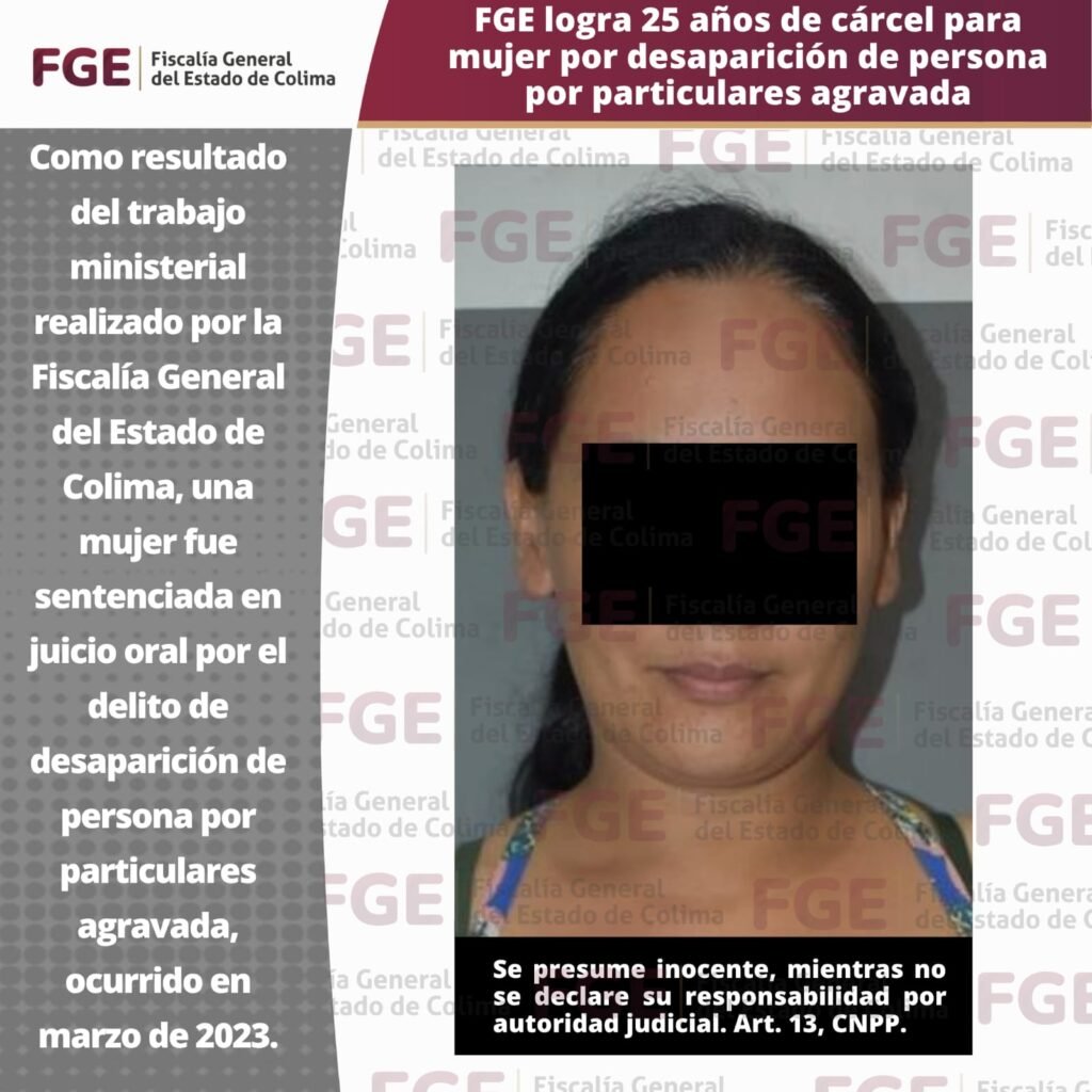 Como resultado del trabajo ministerial realizado por la Fiscalía General del Estado de Colima, una mujer fue sentenciada en juicio oral por el delito de desaparición de persona por particulares agravada, ocurrido en marzo de 2023.