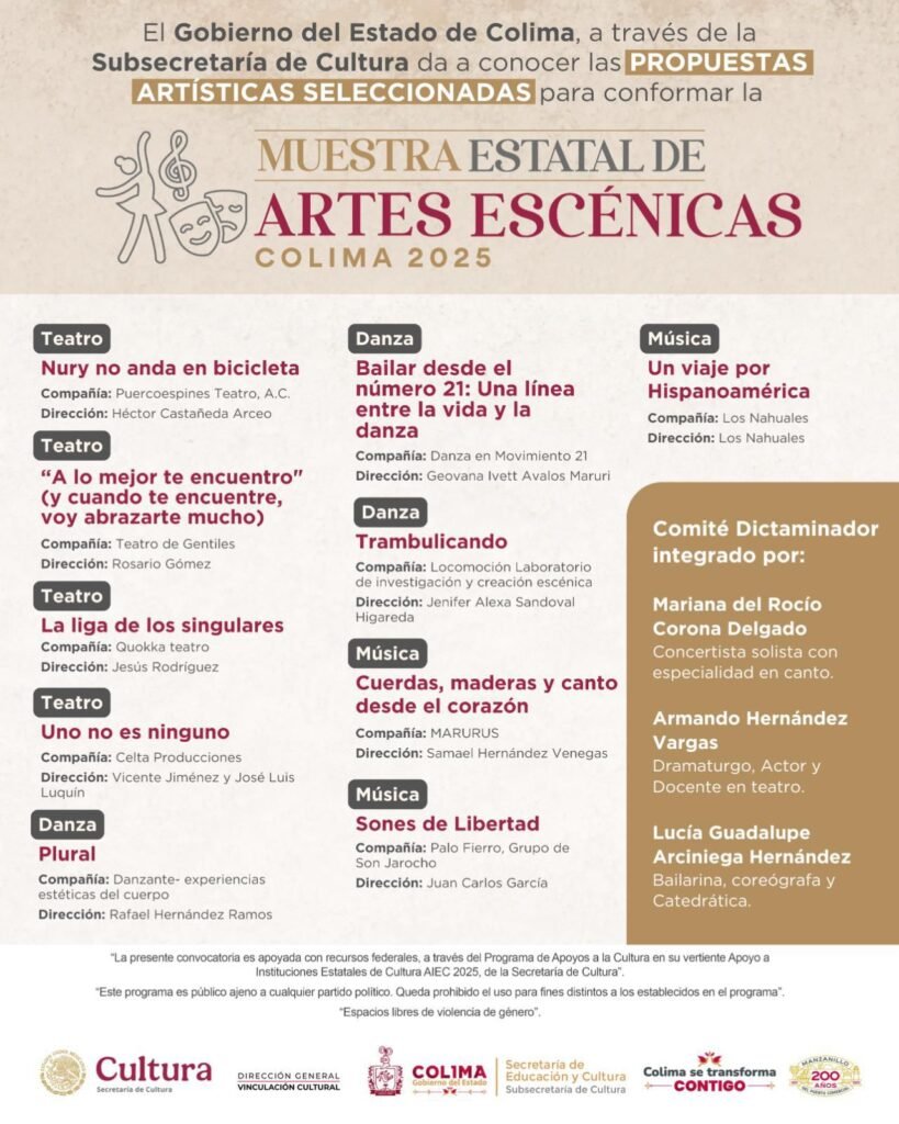 La Subsecretaría de Cultura del Gobierno del Estado de Colima, en coordinación con la Secretaría de Cultura del Gobierno de México, a través de su programa de Apoyo a Instituciones Estatales de Cultura, han publicado los resultados de la convocatoria para la Muestra Estatal de Artes Escénicas Colima 2025, que premiará con estímulos de 25 mil pesos a diez compañías y agrupaciones locales dedicadas a la creación musical, teatral y dancística.