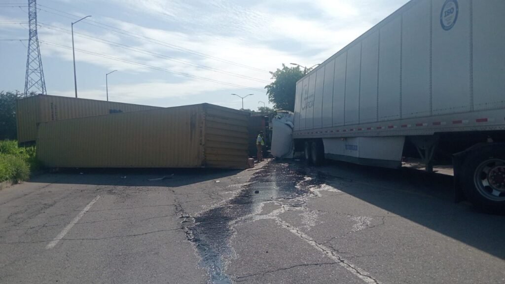 La Unidad Estatal de Protección Civil (UEPC) del Gobierno del Estado de Colima informa que la mañana de este sábado se registró un accidente de tránsito sobre la lateral del libramiento Ejército Mexicano, a la altura del Complejo Administrativo en esta ciudad capital, donde se vieron involucrados tres tractocamiones, uno de los cuales volcó tras el impacto.