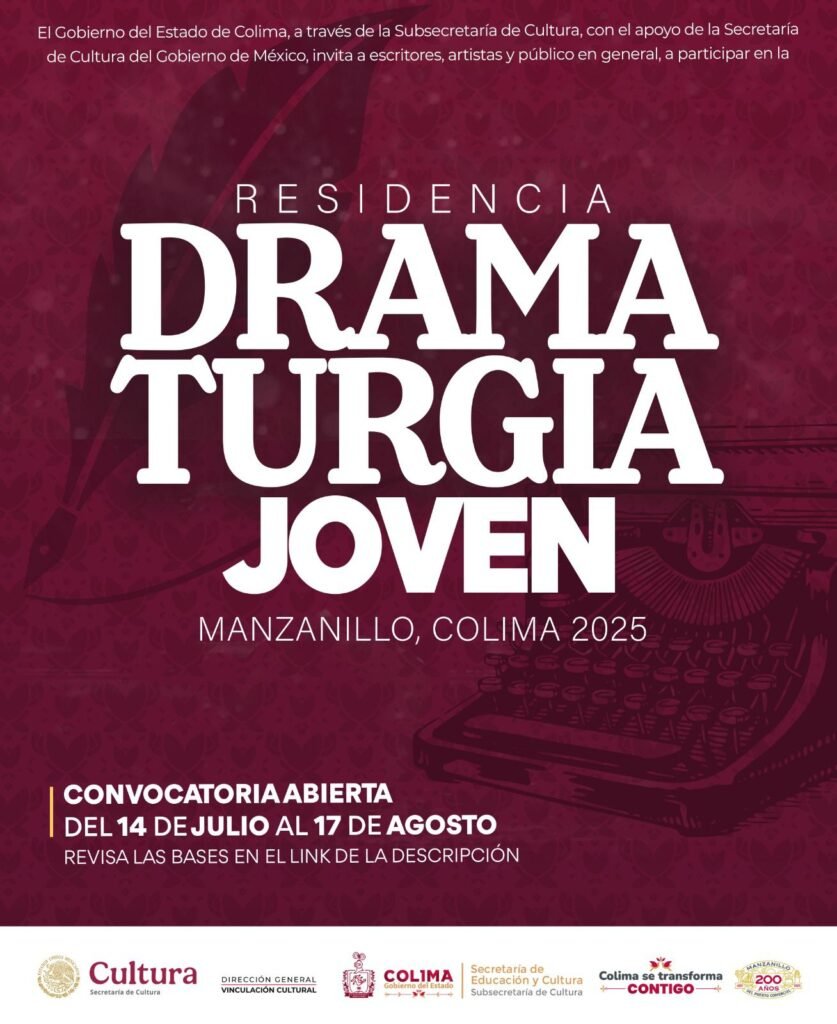 Con el objetivo de contribuir a la formación y profesionalización de escritoras y escritores especializados en la creación de textos dramáticos, la Subsecretaría de Cultura del Gobierno del Estado de Colima, en coordinación con la Secretaría de Cultura del Gobierno de México, a través de su programa de Apoyos a Instituciones Estatales de Cultura, ha publicado la convocatoria para la ‘Residencia en Dramaturgia Joven Colima 2025’, que se llevará a cabo del 27 al 31 de octubre, en Manzanillo.