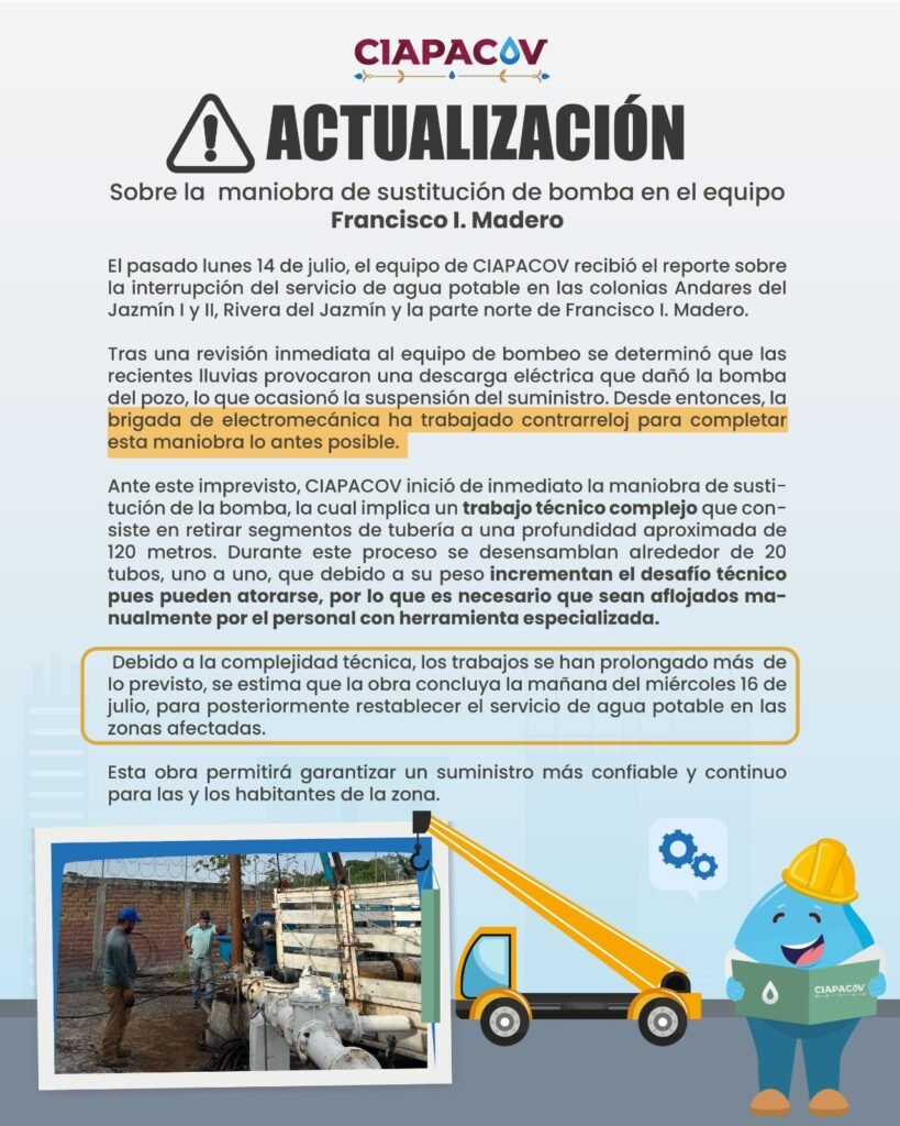 Ante este imprevisto, CIAPACOV inició de inmediato la maniobra de sustitución de la bomba, la cual implica un trabajo técnico complejo que consiste en retirar segmentos de tubería a una profundidad aproximada de 120 metros. Durante este proceso se desensamblan alrededor de 20 tubos, uno a uno, que debido a su peso incrementan el desafío técnico pues pueden atorarse, por lo que es necesario que sean aflojados manualmente por el personal con herramienta especializada.