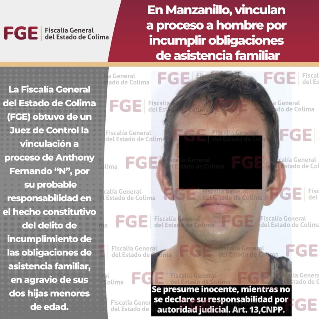 La Fiscalía General del Estado de Colima obtuvo de un Juez de Control la vinculación a proceso de Anthony Fernando “N”, por su probable responsabilidad en el hecho constitutivo del delito de incumplimiento de las obligaciones de asistencia familiar, en agravio de sus dos hijas menores de edad.