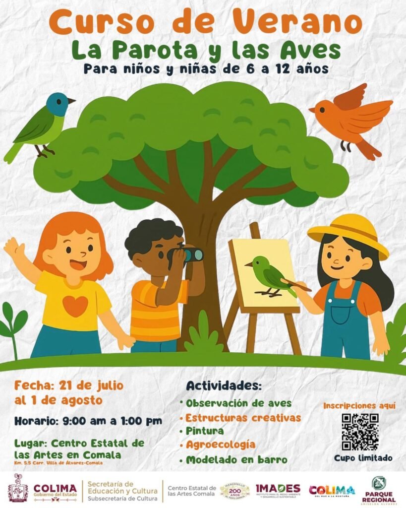 La Subsecretaría de Cultura del Gobierno del Estado de Colima, a través del Centro Estatal de las Artes (CEA) Comala, en coordinación con el Instituto para el Medio Ambiente y Desarrollo Sustentable (Imades), la Subsecretaría de Turismo y el Parque Regional Metropolitano ‘Griselda Álvarez’, ofrecerán de manera gratuita el curso de verano 2025 ‘La Parota y las Aves”, dirigido a infancias de 6 a 12 años.