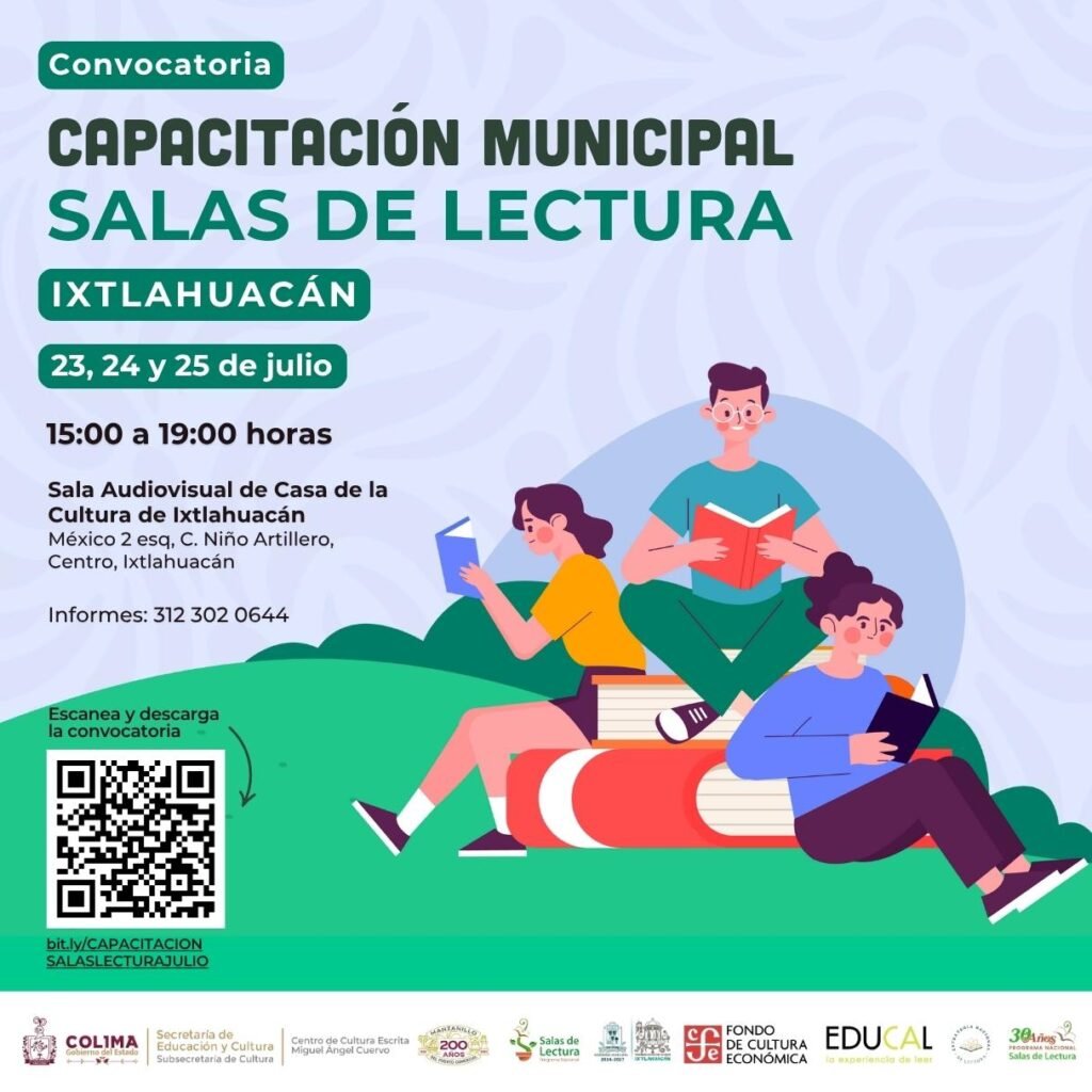 La Subsecretaría de Cultura del Gobierno del Estado de Colima, en coordinación con el Programa Nacional de Salas de Lectura y el Ayuntamiento de Ixtlahuacán, invitan a la población interesada en aprender y desarrollar actividades voluntarias de fomento a la lectura en su comunidad, a integrarse a la ‘Capacitación Municipal en Salas de Lectura’ que se impartirá en este municipio.