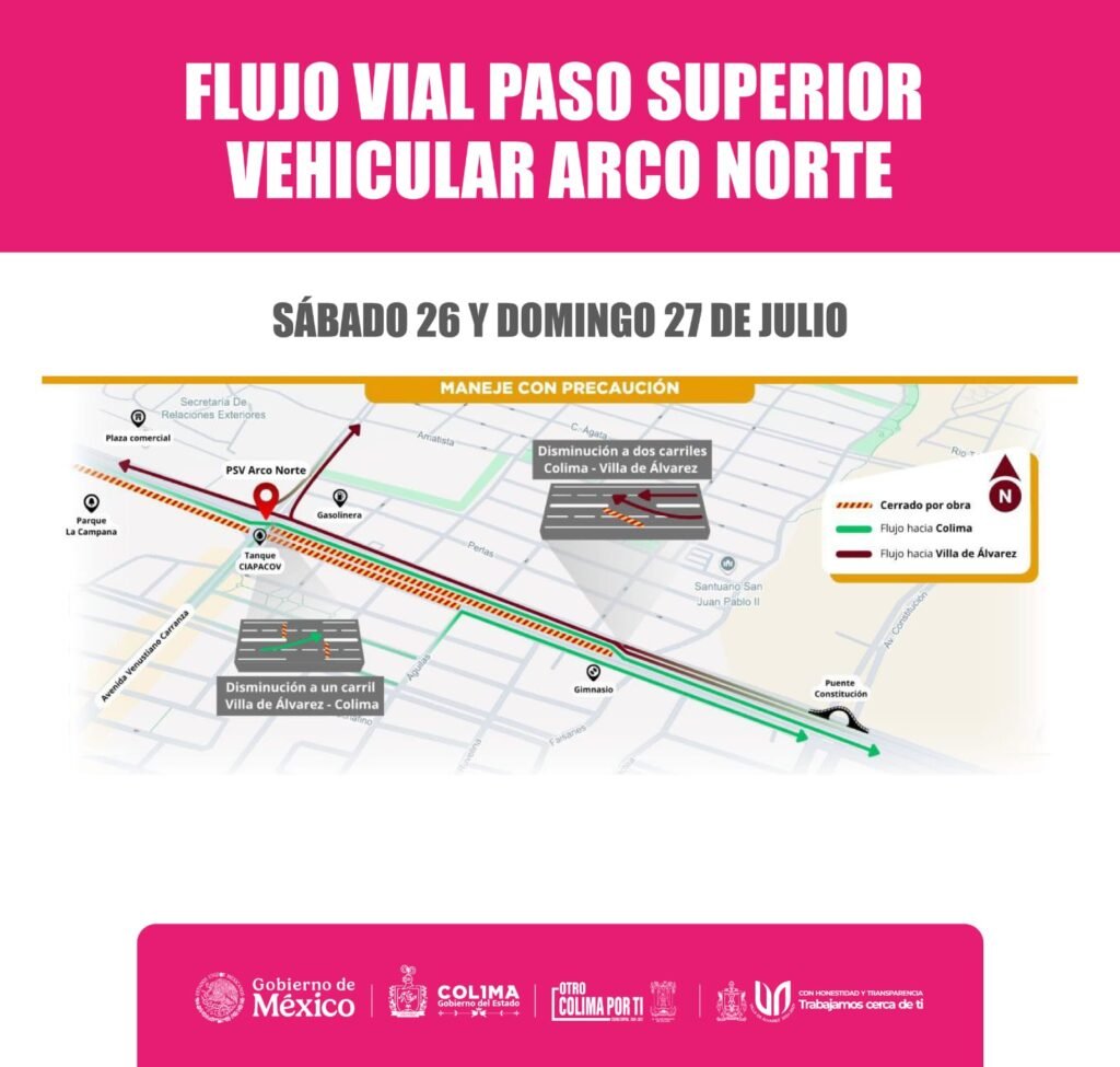 El gobierno municipal de Villa de Álvarez recomienda a las y los conductores que transitan por esa área de la Zona Conurbada, consultar las redes sociales de los ayuntamientos de Villa de Álvarez y de Colima, del Gobierno del Estado de Colima y de la Secretaría de Infraestructura, Comunicaciones y Trasportes, para mantenerse informados sobre la circulación vehicular de esa vialidad mientras se realizan los trabajos de construcción del Arco Norte en la avenida Venustiano Carranza.