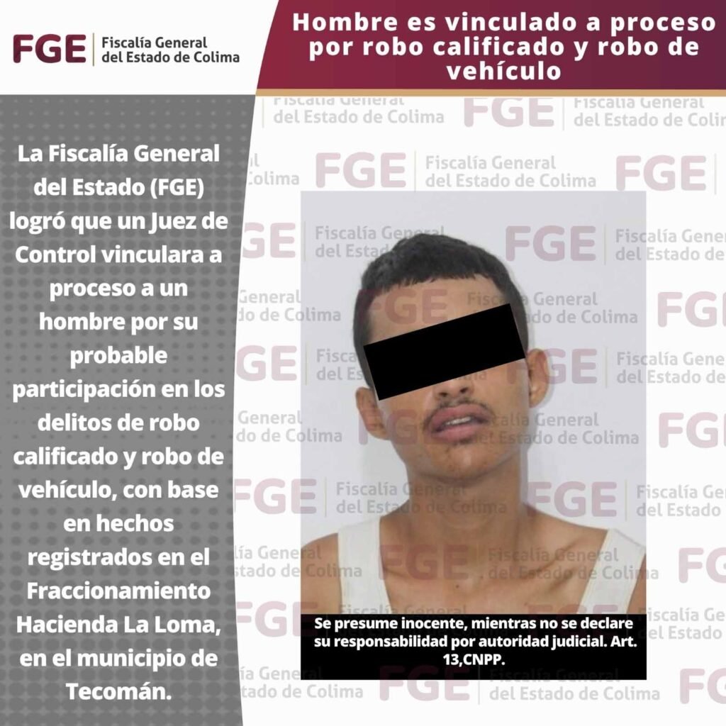 La Fiscalía General del Estado (FGE) logró que un Juez de Control vinculara a proceso a un hombre por su probable participación en los delitos de robo calificado y robo de vehículo, con base en hechos registrados en el Fraccionamiento Hacienda La Loma, en el municipio de Tecomán.
