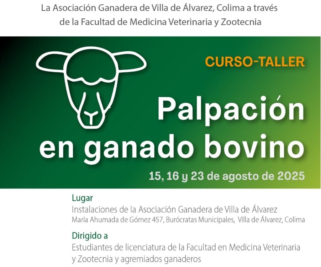 Con el objetivo de fortalecer las capacidades técnicas del sector ganadero y brindar formación práctica a sus estudiantes, la Asociación Ganadera Local de Villa de Álvarez, Colima, en coordinación con la Facultad de Medicina Veterinaria y Zootecnia (FMVZ) de la Universidad de Colima, impartirán el Curso “Palpación en Ganado Bovino” los días 15, 16 y 23 de agosto.