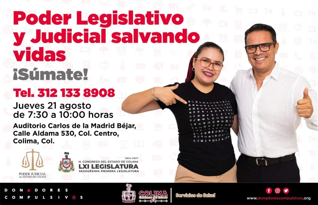 Con el objetivo de fomentar la cultura de donación altruista, los Poderes Legislativo y Judicial del Estado de Colima, en coordinación con la organización Donadores Compulsivos, llevarán a cabo una campaña de donación de sangre abierta al público en general.