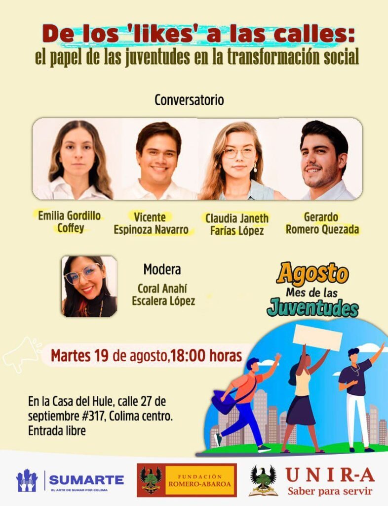 En el marco de Agosto, Mes de las Juventudes, la Fundación Romero-Abaroa, en conjunto con SUMARTE y el Instituto de Educación Universitaria Romero-Abaroa (UNIR-A), invita a la ciudadanía a participar en dos actividades gratuitas que buscan impulsar la voz, creatividad y participación social de las y los jóvenes colimenses.