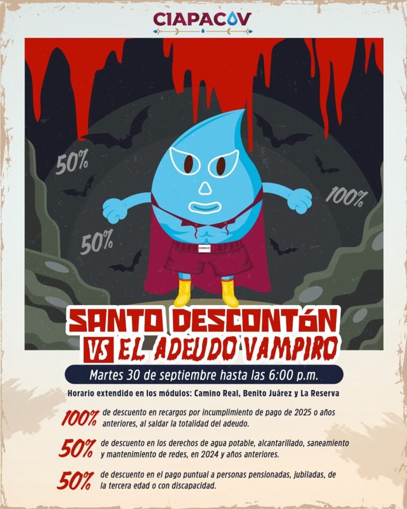 El Director General de CIAPACOV, Vladimir Parra Barragán, invita a todas y todos los usuarios a aprovechar de un “Santo Descontón vs el adeudo vampiro”, este martes 30 de septiembre habrá importantes descuentos para ponerse al corriente en el pago del servicio de agua, además de horario extendido, de 8:00 a.m. a 6:00 p.m., en las sucursales de Camino Real (Colima), Benito Juárez y La Reserva (Villa de Álvarez)
