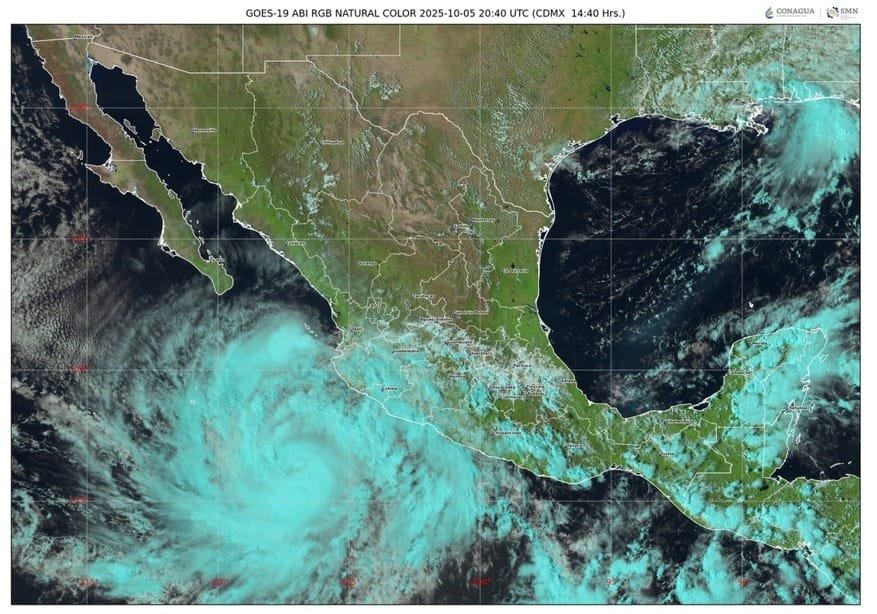 De acuerdo con información de la Comisión Nacional del Agua (Conagua), el centro del huracán se localiza aproximadamente a 470 kilómetros al sur-suroeste de Cabo Corrientes, Jalisco, y a 780 kilómetros al sur-sureste de Cabo San Lucas, Baja California Sur. Presenta vientos máximos sostenidos de 120 kilómetros por hora, rachas de hasta 150 km/h y se desplaza hacia el nor-noroeste a una velocidad de 6 km/h.