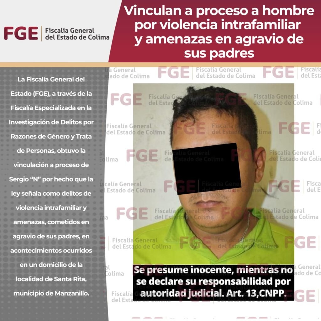 La Fiscalía General del Estado (FGE), a través de la Fiscalía Especializada en la Investigación de Delitos por Razones de Género y Trata de Personas, obtuvo la vinculación a proceso de Sergio “N” por hecho que la ley señala como delitos de violencia intrafamiliar y amenazas, cometidos en agravio de sus padres, en acontecimientos ocurridos en un domicilio de la localidad de Santa Rita, municipio de Manzanillo.