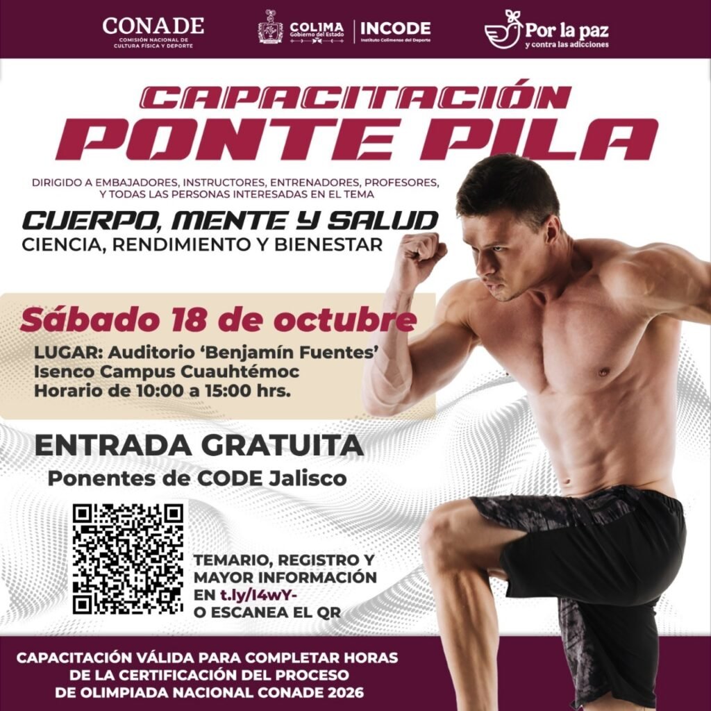 El Gobierno del Estado de Colima, a través del Instituto Colimense del Deporte (Incode), en coordinación con la Comisión Nacional de Cultura Física y Deporte (Conade) y el Consejo Estatal para el Fomento Deportivo del Estado de Jalisco, invitan a participar en la capacitación ‘Cuerpo, Mente y Salud’ del programa de activación física ‘Ponte Pila’, en el auditorio “Benjamín Fuentes González” del Instituto Superior de Educación Normal del Estado de Colima (Isenco) campus Cuauhtémoc, este sábado 18 de octubre, de las 10:00 de la mañana a las 3:00 de la tarde.