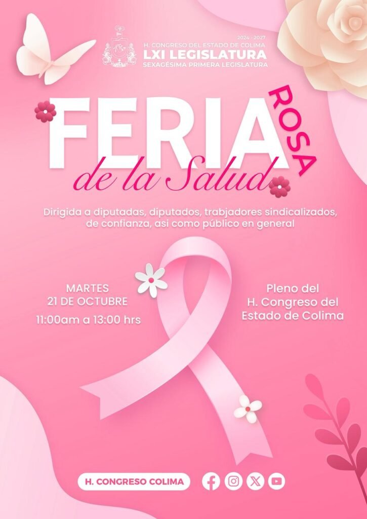 En el marco del Mes de Sensibilización Sobre el Cáncer de Mama, este martes 21 de octubre, en el H. Congreso del Estado de Colima, se llevará a cabo la “Feria Rosa de la Salud”, con la cual se busca visibilizar, sensibilizar, promover y crear conciencia sobre la detección, diagnóstico y tratamiento oportuno del cáncer de mama.