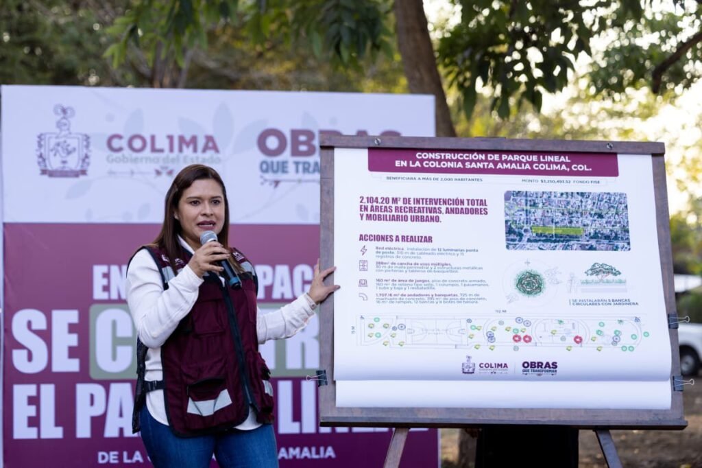 Al continuar su agenda de trabajo la tarde de este miércoles, la gobernadora Indira Vizcaíno Silva puso en marcha una más de las #ObrasQueTransforman Colima, para construir un parque lineal en la colonia Santa Amalia de esta capital, que contará con cancha de usos múltiples, área de juegos infantiles, bancas, rampas y andadores, con inversión de más de 3.2 millones de pesos (mdp).
