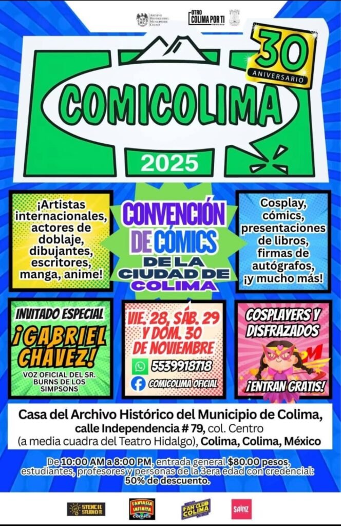 - El Ayuntamiento de Colima invita a disfrutar de Comicolima 2025 los días 28, 29 y 30 de noviembre, con actividades para toda la familia, invitados especiales como Gabriel Chávez —voz del Sr. Burns—, proyecciones, libros, cosplay y más, en la Casa del Archivo Histórico