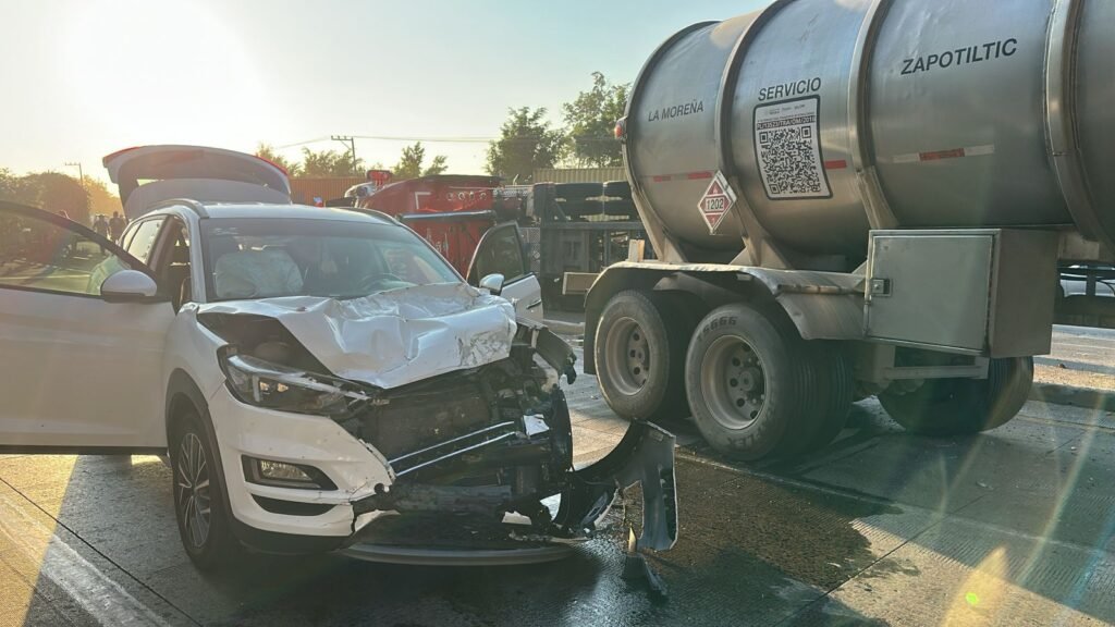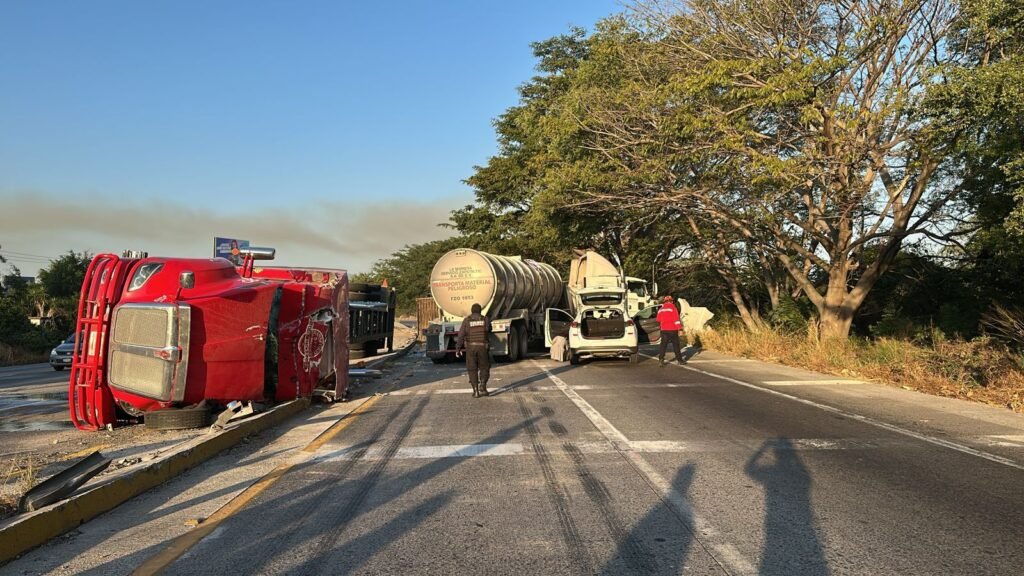 Una de las unidades quedó atravesada en el sentido Colima–Manzanillo, mientras que el otro tráiler se encuentra en dirección opuesta; además, la camioneta tipo SUV chocó y quedó a un costado.