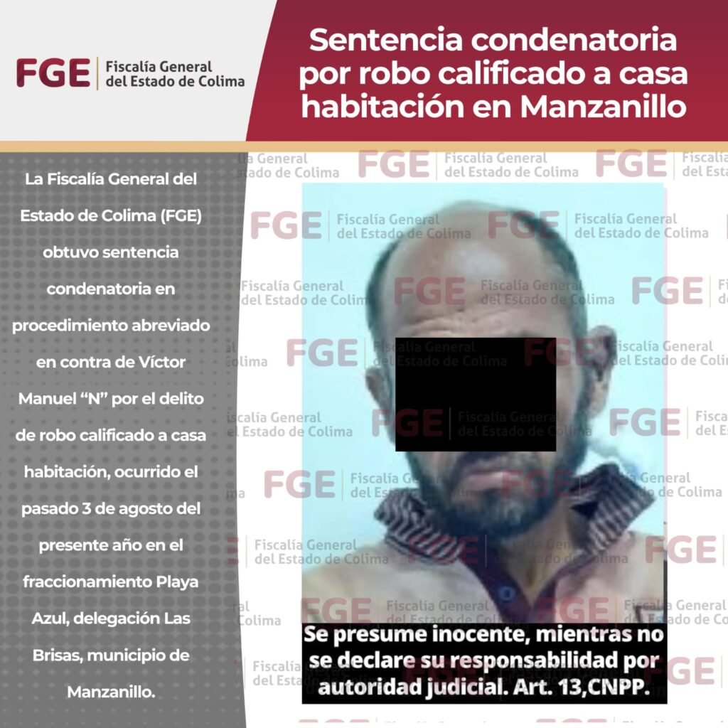 La Fiscalía General del Estado de Colima (FGE) obtuvo sentencia condenatoria en procedimiento abreviado en contra de Víctor Manuel “N” por el delito de robo calificado a casa habitación, ocurrido el pasado 3 de agosto del presente año en el fraccionamiento Playa Azul, delegación Las Brisas, municipio de Manzanillo. De acuerdo con lo establecido en […]