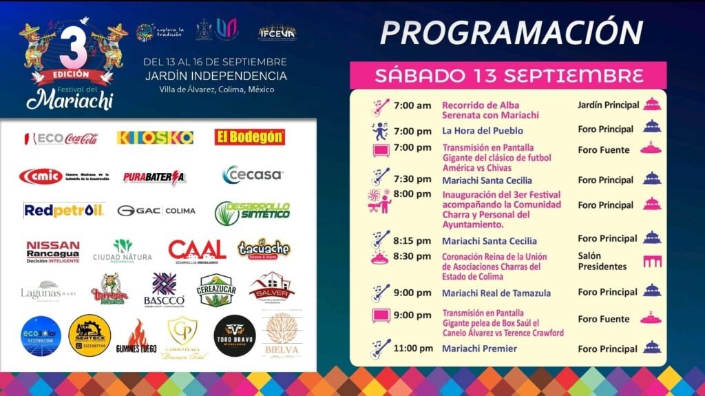 Con la presentación de cinco mariachis, este sábado 13 de septiembre iniciará el Tercer Festival del Mariachi de Villa de Álvarez, que en su edición del año 2025 en dos foros del Jardín Principal además habrá degustaciones de mezcal y tequila, venta de comida, la proyección en pantalla gigante del partido América contra Chivas y […]