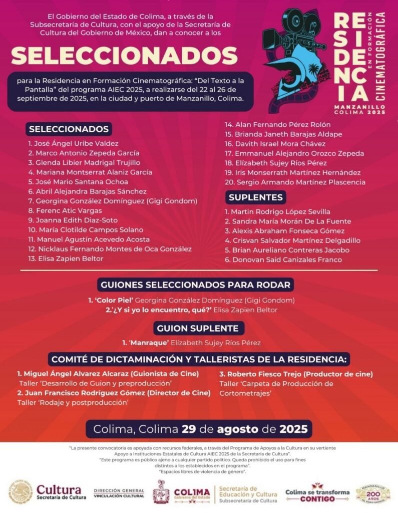 La Subsecretaría de Cultura del Gobierno del Estado de Colima, en coordinación con la Secretaría de Cultura del Gobierno de México, a través del programa federal de Apoyos a Instituciones Estatales de Cultura, publican la lista de personas seleccionadas para integrar la Residencia en Formación Cinematográfica Manzanillo 2025, que se llevará a cabo del 22 […]