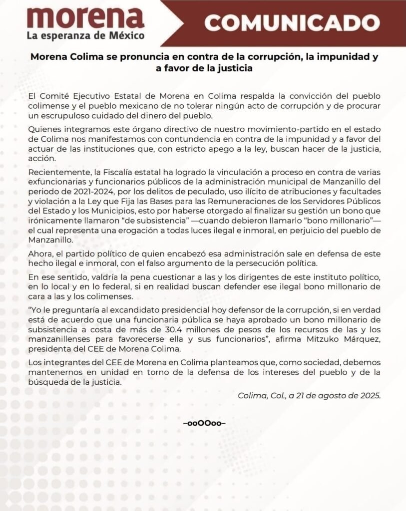 El Comité Ejecutivo Estatal de Morena en Colima respalda la convicción del pueblo colimense y el pueblo mexicano de no tolerar ningún acto de corrupción y de procurar un escrupuloso cuidado del dinero del pueblo. Quienes integramos este órgano directivo de nuestro movimiento-partido en el estado de Colima nos manifestamos con contundencia en contra de […]