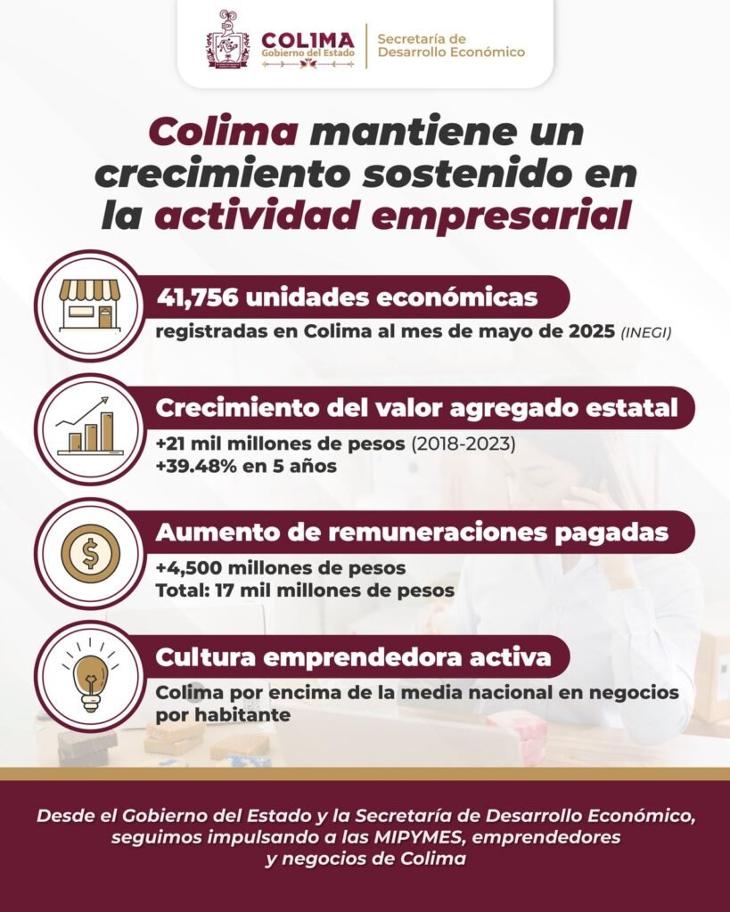 La Secretaría de Desarrollo Económico (Sedeco) del Gobierno del Estado destacó que, de acuerdo con datos del Instituto Nacional de Estadística y Geografía (INEGI), Colima hoy cuenta con 41,756 unidades económicas en funcionamiento, lo que representa un crecimiento sostenido en los últimos años. Tan solo entre 2018 y 2023, el número de establecimientos aumentó en […]