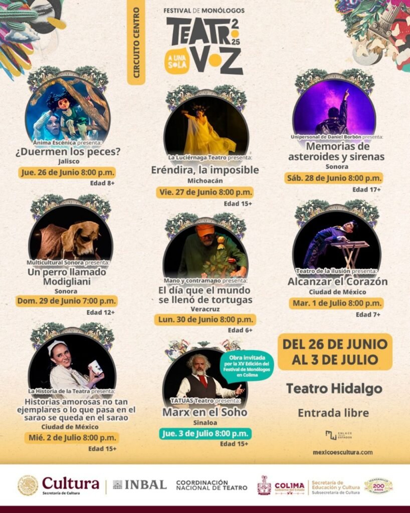 Subsecretaría de Cultura Colima anuncia funciones gratuitas del 20° Festival de Monólogos en el Teatro Hidalgo