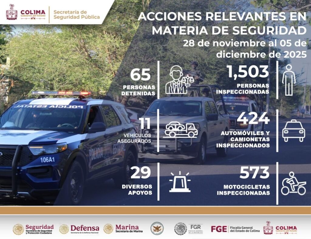 La Secretaría de Seguridad Pública (SSP) del Gobierno del Estado de Colima, en coordinación con personal operativo de la Secretaría de Marina Armada de México (Semar) y la Policía Estatal Preventiva (PEP), lograron la detención de 65 personas durante la semana del 28 de noviembre al 5 de diciembre, mediante la ‘Operación Coliman’, que tiene […]