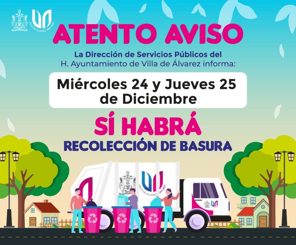 Villa de Álvarez, Col.- El Ayuntamiento de Villa de Álvarez, a través de la Dirección de Servicios Públicos Municipales, informa a la población que este miércoles 24 y jueves 25 de diciembre la recolección de basura en las colonias y comunidades del municipio se realizará de manera normal. Cumpliendo con el compromiso de prestar servicios […]