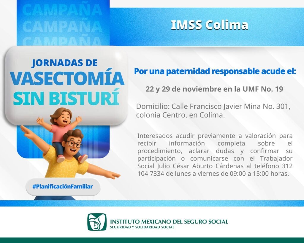• Es un procedimiento seguro, gratuito y de rápida recuperación, con efectividad superior al 99%. El Instituto Mexicano del Seguro Social (IMSS) en Colima invita a los hombres interesados en métodos de planificación familiar a participar en las Jornadas de Vasectomía sin Bisturí, que se llevarán a cabo el 22 y 29 de noviembre en […]