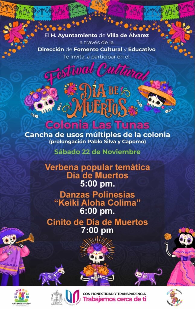 El H. Ayuntamiento de Villa de Álvarez, a través de la Dirección de Fomento Cultural y Educativo, invita a la población a disfrutar del Festival Cultural de Día de Muertos que se llevará a cabo este sábado 22 de noviembre en la cancha de usos múltiples de la colonia Las Tunas, ubicada en prolongación Pablo […]