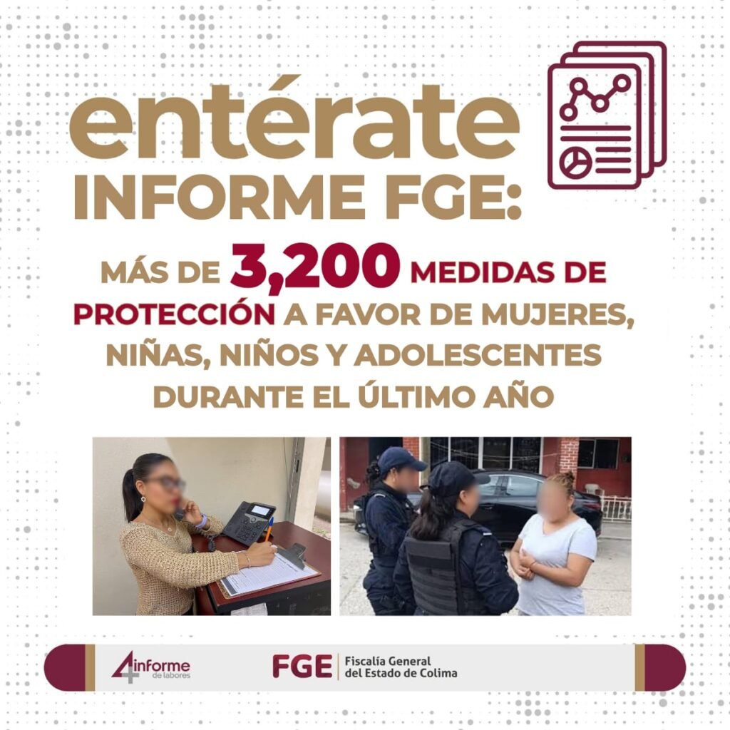 En el marco del Cuarto Informe de Actividades del Fiscal General del Estado, Bryant Alejandro García Ramírez, la Fiscalía General del Estado de Colima (FGE) informa que, del 01 de noviembre de 2024 al 31 de octubre de 2025, fortaleció de manera significativa su compromiso con la protección de los derechos de las mujeres y de los grupos en situación de vulnerabilidad.