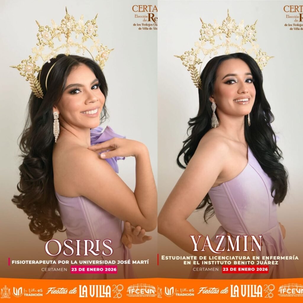 Las aspirantes al título de Reina de la Máxima Fiesta de las y lo Villalvarenses son Osiris Janice Flores Méndez, quien es egresada de la carrera de Fisioterapeuta, y Yazmín Zaragoza Montero, estudiante de la carrera de Enfermería.