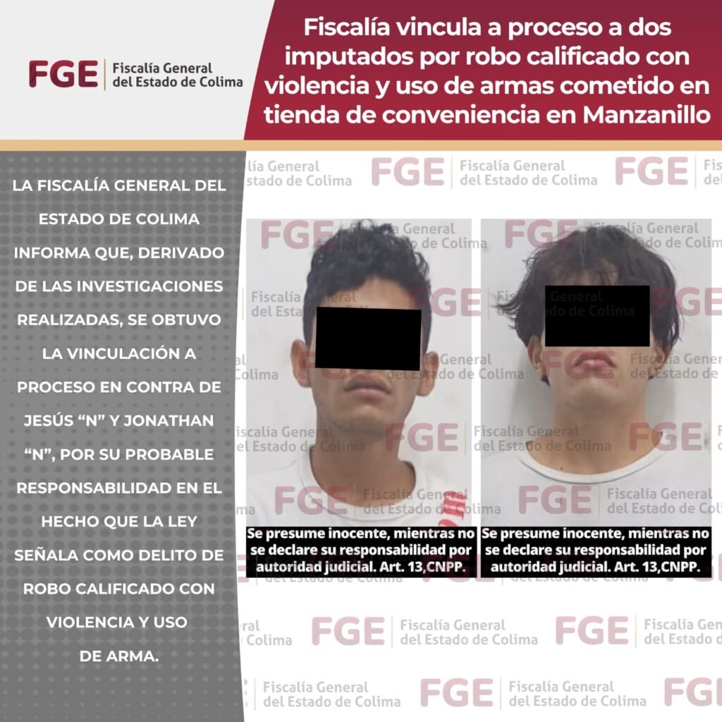 La Fiscalía General del Estado de Colima informa que, derivado de las investigaciones realizadas, se obtuvo la vinculación a proceso en contra de Jesús “N” y Jonathan “N”, por su probable responsabilidad en el hecho que la ley señala como delito de robo calificado con violencia y uso de arma.