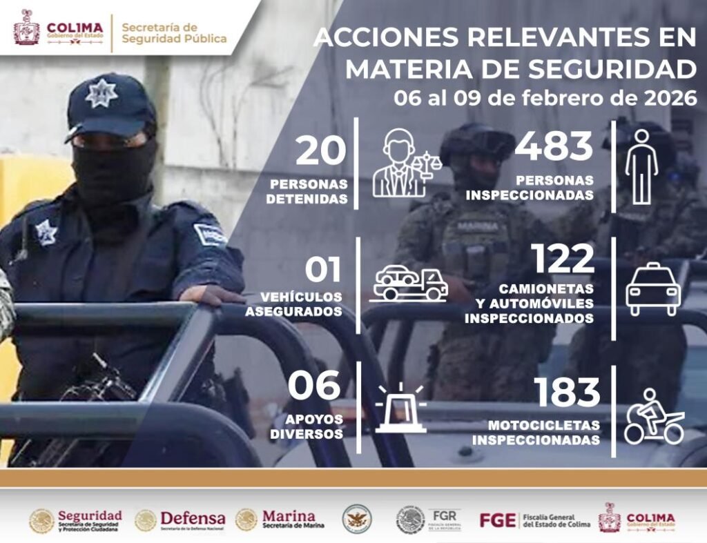 Derivado de la estrecha coordinación entre instituciones del Gobierno de México y del Gobierno del Estado de Colima, durante el fin de semana fueron detenidas veinte personas en diversos hechos, por su probable participación en delitos contra la salud, robo calificado, violencia familiar y faltas administrativas, como parte de la Operación Coliman que llevan a cabo la Secretaría de Seguridad Pública (SSP), Policía Estatal Preventiva (PEP) y Secretaría de Marina, para reducir la incidencia delictiva y fortalecer la seguridad en los diez municipios de la entidad.