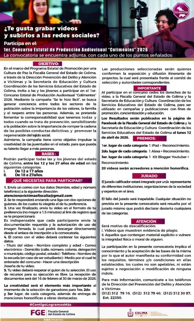 Convencidos de que la prevención del delito comienza con la participación activa de las y los jóvenes, la Fiscalía General del Estado de Colima (FGE), en coordinación con la Secretaría de Educación y Cultura, presentó el 1er. Concurso Estatal de Producción Audiovisual “Colimentes” 2026, una iniciativa que apuesta por el talento juvenil como motor de transformación social.