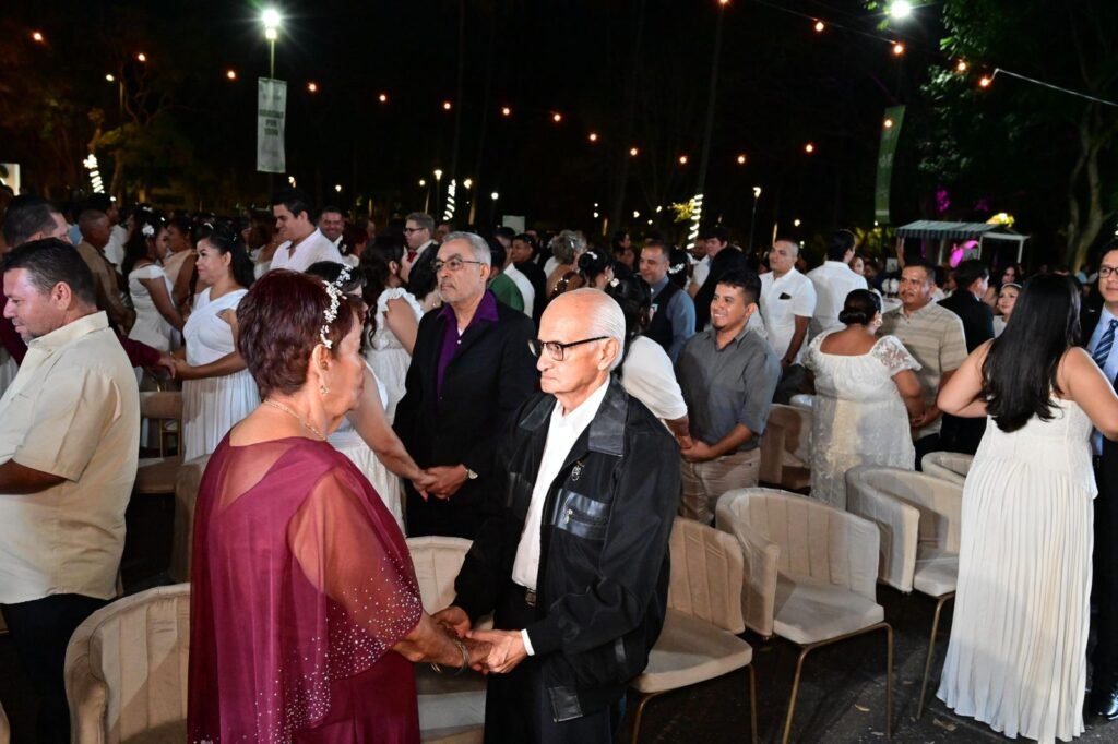 Durante la ceremonia, de manera simbólica se realizó el enlace de la pareja conformada por Luis Andrés y Brenda del Carmen, quienes, tomados de la mano y mirándose a los ojos, expresaron el “Sí, acepto” y, de manera simultánea, las 120 nuevas familias firmaron el acta correspondiente, legitimando así su enlace.