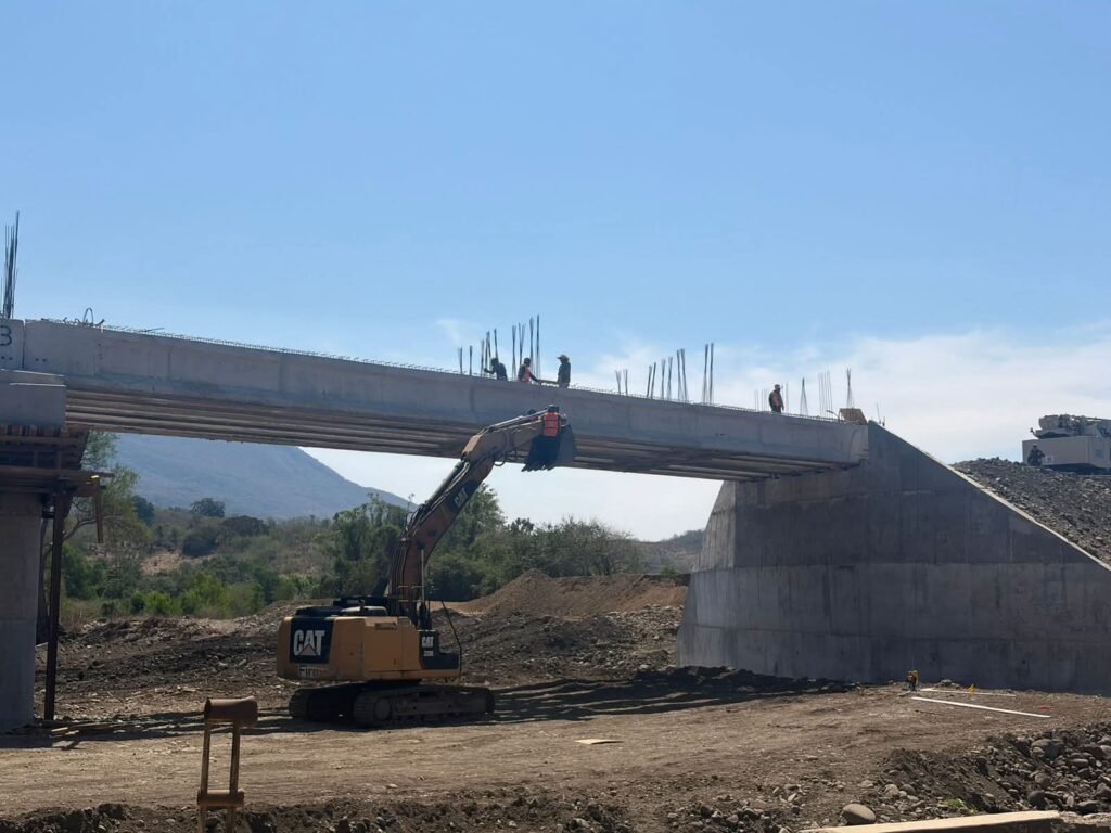 Actualmente se registran avances en el colado y cimbrado de cabezales y columnas, el rastreo de cauce, la conformación de bordos de encauzamiento, la formación de aproches en terracerías, así como el habilitado de acero para dentellón, colado de dentellón y postensado de trabes tipo AASHTO.