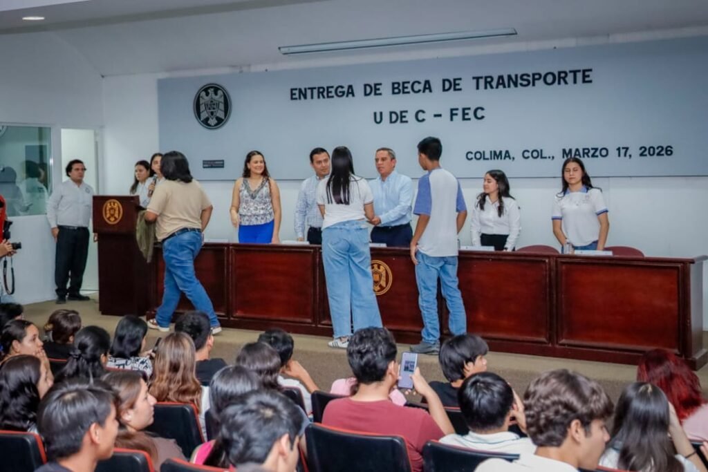 Un total de 400 estudiantes (300 de la zona conurbada Colima-Villa de Álvarez y 100 de Manzanillo) de secundaria, bachillerato y licenciatura, de la Universidad de Colima y de otras escuelas del estado, recibieron el martes 17 de marzo por la tarde la Beca de Transporte FEC-UdeC, en el Auditorio de la Facultad de Ciencias de la Educación del campus central. Encabezaron el evento el rector Christian Jorge Torres Ortiz Zermeño y el presidente de la Federación de Estudiantes Colimenses, Jaime Alejandro Novela Castañeda.
