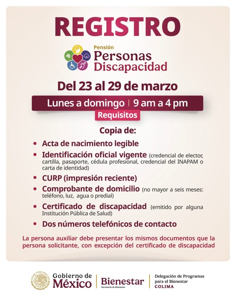 Del 23 al 29 de marzo se realizará el registro a la Pensión para el Bienestar de las Personas con Discapacidad, motivo por el cual se instalarán Módulos de Atención en los 10 municipios del estado, informó la delegada de Programas para el Bienestar en Colima, Rosario Silva Verduzco.