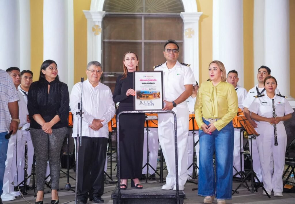 A la presentación de la Banda Sinfónica de la Secretaría de Marina asistieron el Párroco de San Francisco de Asís, José de Jesús Ramos Hueso; la Diputada Local, Betzaida Pinzón, y la Secretaria del Ayuntamiento de Villa de Álvarez, Lizet Rodríguez.