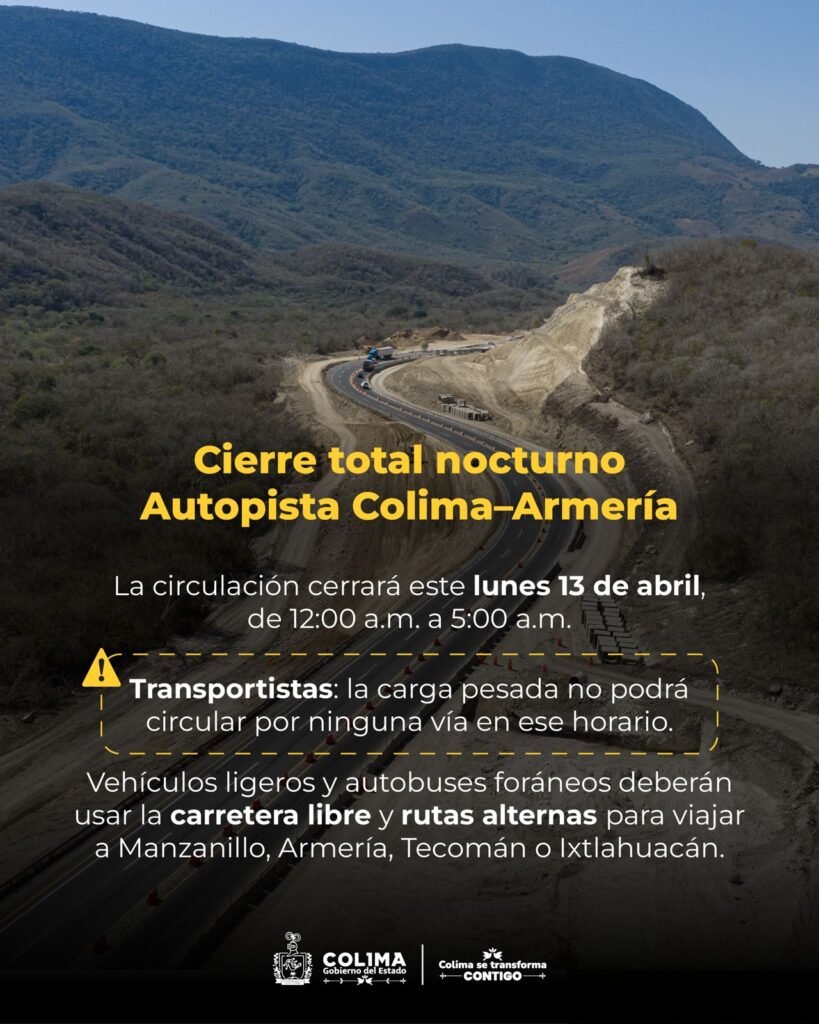 Debe considerarse que durante este cierre total, el transporte de carga pesada no podrá circular por ninguna vía; asimismo, los vehículos ligeros y autobuses foráneos deberán utilizar la carretera libre y rutas alternas para trasladarse hacia Manzanillo, Armería, Tecomán o Ixtlahuacán.