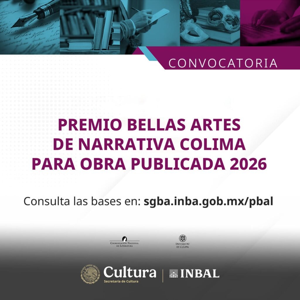 La Secretaría de Cultura del Gobierno de México y el Instituto Nacional de Bellas Artes y Literatura (INBAL) a través de la Coordinación Nacional de Literatura (CNL), en colaboración con la Universidad de Colima, convocan al Premio Bellas Artes de Narrativa Colima para Obra Publicada 2026, uno de los reconocimientos más importantes del país.