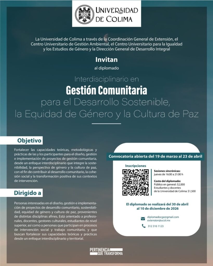 Para enfrentar de una mejor manera los desafíos sociales, ambientales y culturales del contexto actual, la Universidad de Colima invita al Diplomado Interdisciplinario en Gestión Comunitaria para el Desarrollo Sostenible, la Equidad de Género y la Cultura de Paz, una propuesta formativa orientada a fortalecer las capacidades de intervención comunitaria desde enfoques integrales, éticos y contextualizados.