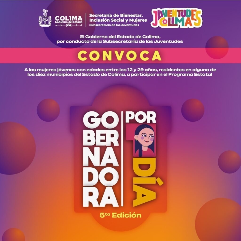 El Gobierno del Estado de Colima, encabezado por la mandataria Indira Vizcaíno Silva, a través de la Subsecretaría de las Juventudes (Subsejuv), convoca a niñas y mujeres de entre 12 y 29 años de edad, a participar en el programa ‘Gobernadora por un Día’. Esta iniciativa busca impulsar la participación activa de las mujeres jóvenes en la vida pública de la entidad.