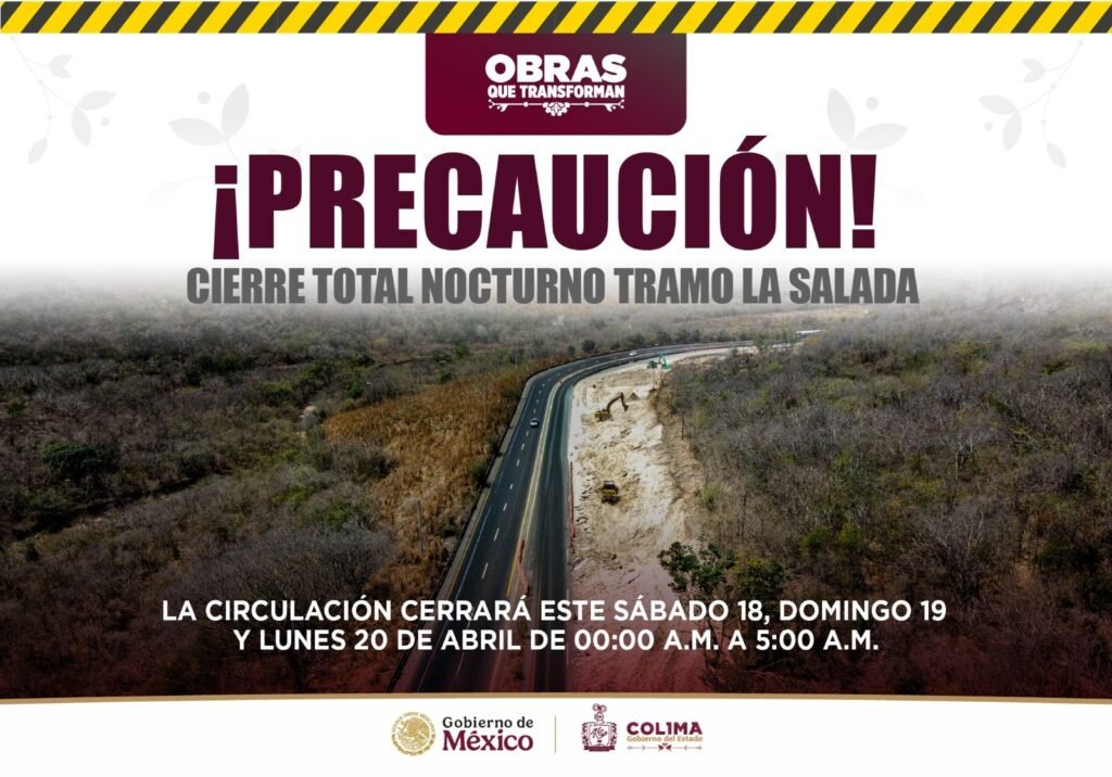 La circulación permanecerá suspendida durante este sábado 18, domingo 19 y lunes 20 de abril, en de 12:00 de la noche a 5:00 de la mañana, para realizar las labores de ampliación de carriles y mejorar la infraestructura carretera en el Corredor Logístico Colima-Manzanillo.