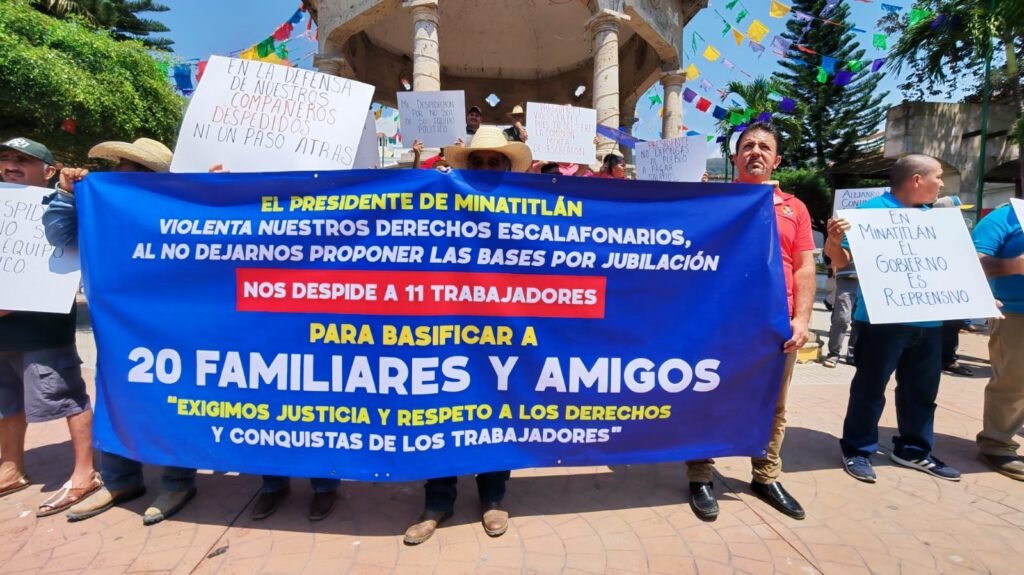 Trabajadores del Ayuntamiento de Minatitlán se manifestaron este jueves por la tarde al exterior de la presidencia municipal para exigir al presidente municipal, Alejandro Cicerón Mancilla González, a quien acusaron de despedir injustificadamente a once trabajadores sindicalizados, para basificar a veinte familiares.