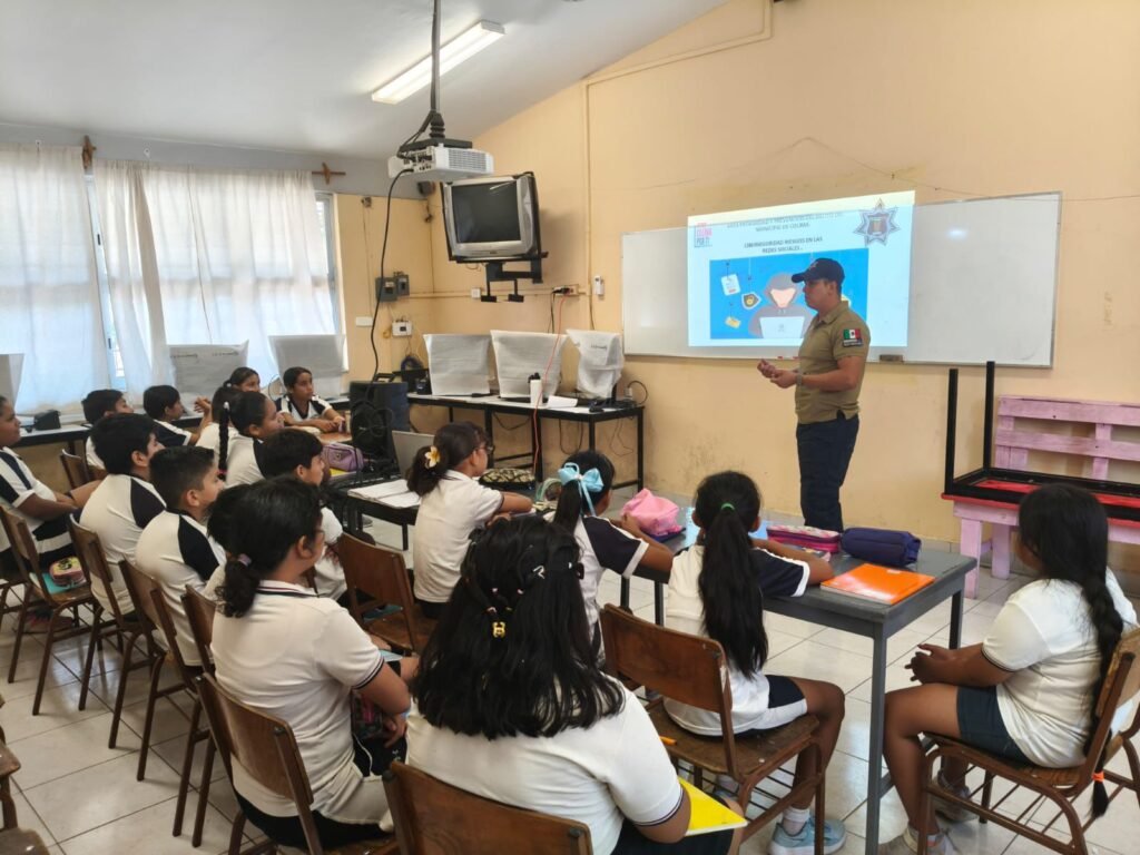 Colima, Colima. – Con el firme propósito de proteger a las infancias colimenses de los riesgos del entorno digital, la Policía Municipal de Colima, a través de su Área de Proximidad y Prevención del Delito, llevó a cabo una jornada de capacitación titulada “Ciberseguridad en Redes Sociales” en la Escuela Primaria Eduardo Zarza Ocampo, ubicada en la colonia San Rafael.