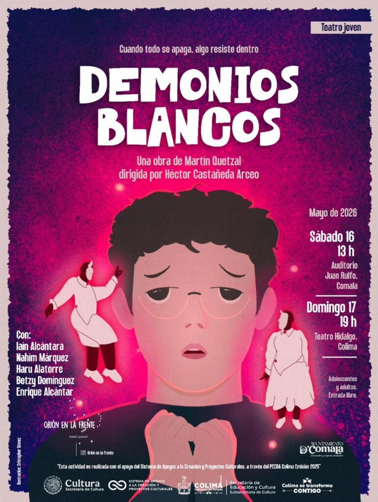 La compañía Orión en la Frente estrenará la obra ‘Demonios Blancos’, resultante del proyecto de Érick Iaín Alcántara, beneficiario en la categoría Adolescentes Creadores – Nuevos Talentos del Programa de Estímulos a la Creación y Desarrollo Artístico (PECDA), otorgado por la Secretaría de Cultura del Gobierno de México y la Subsecretaría de Cultura del Gobierno del Estado de Colima.